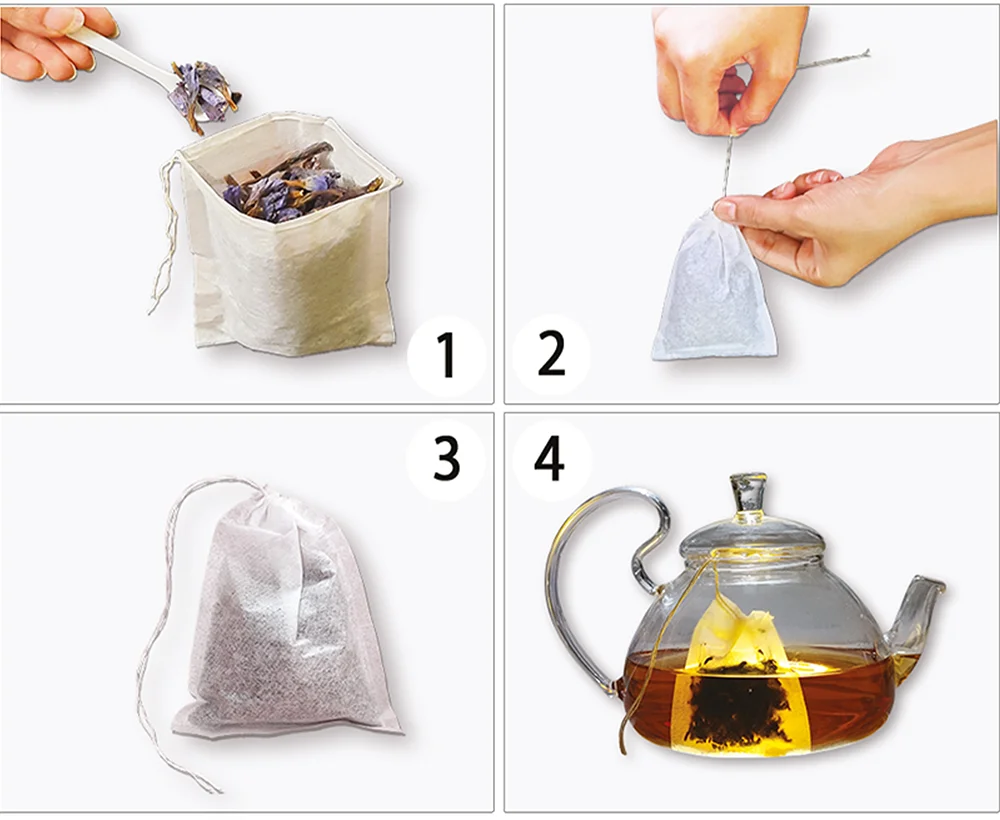 فیلتر چای با موادی از جمله چای، دمنوش یا قهوه پر می شود و با کشیدن نخ آن درب فیلتر بسته می شود، سپس می توانید فیلتر پر شده را درون قوری، ماگ و فلاسک خود بیاندازید و پس از استفاده آن را دور انداخته و علاوه بر صرفه جویی در مصرف آب و بهبود نظافت، دیگر نگران شستشوی تفاله چای، دمنوش و قهوه نباشید. جنس کاغذ فیلترها از الیاف طبیعی چوب درخت آباکا و جنس نخ آن پنبه ای می باشد و هیچ گونه آسیبی به سلامتی انسان وارد نمی کند. این محصول کاملا تجزیه پذیر است و با محیط زیست سازگار می باشد.